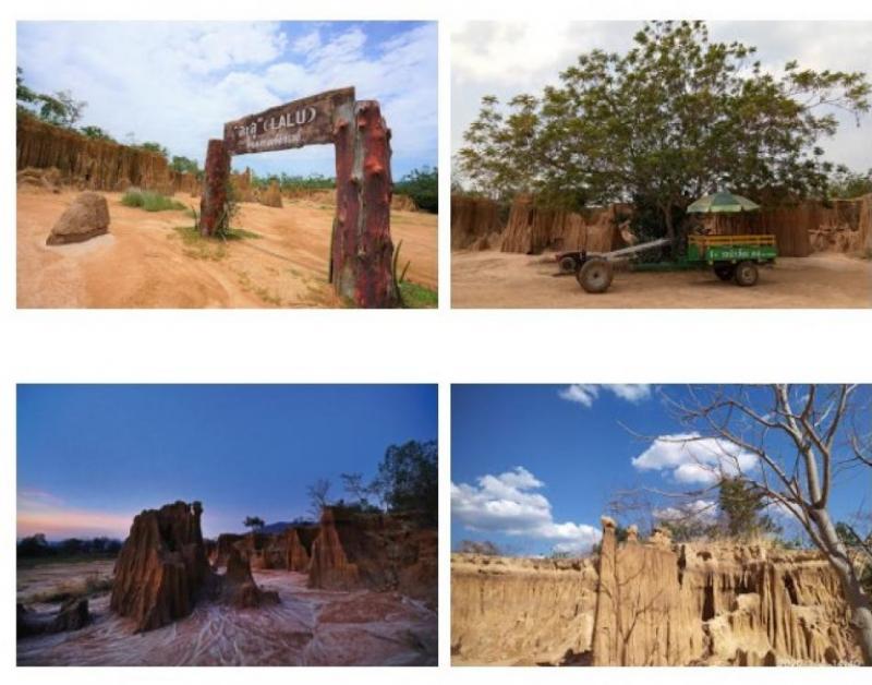 รายละเอียด : เป็นปราฎกการณ์ธรรมชาติที่เกิดขึ้นกับผืนดินในพื้นที่ของสองหมู่บ้าน ในตำบลทัพราช อำเภอตามพระยา จังหวัดสระแก้ว นั้นคือการกัดเซาะของลมและน้ำ ทำให้ผิหน้าของผืนแผ่นดินที่มีความนิ่มยุบตัวลงไปคงเหลือไว้เพียงส่วนที่แข็งแกร่ง ยืนตระหง่านเป็นกำแพลงและเสารรูปทรงแปลกตานั้นเอง