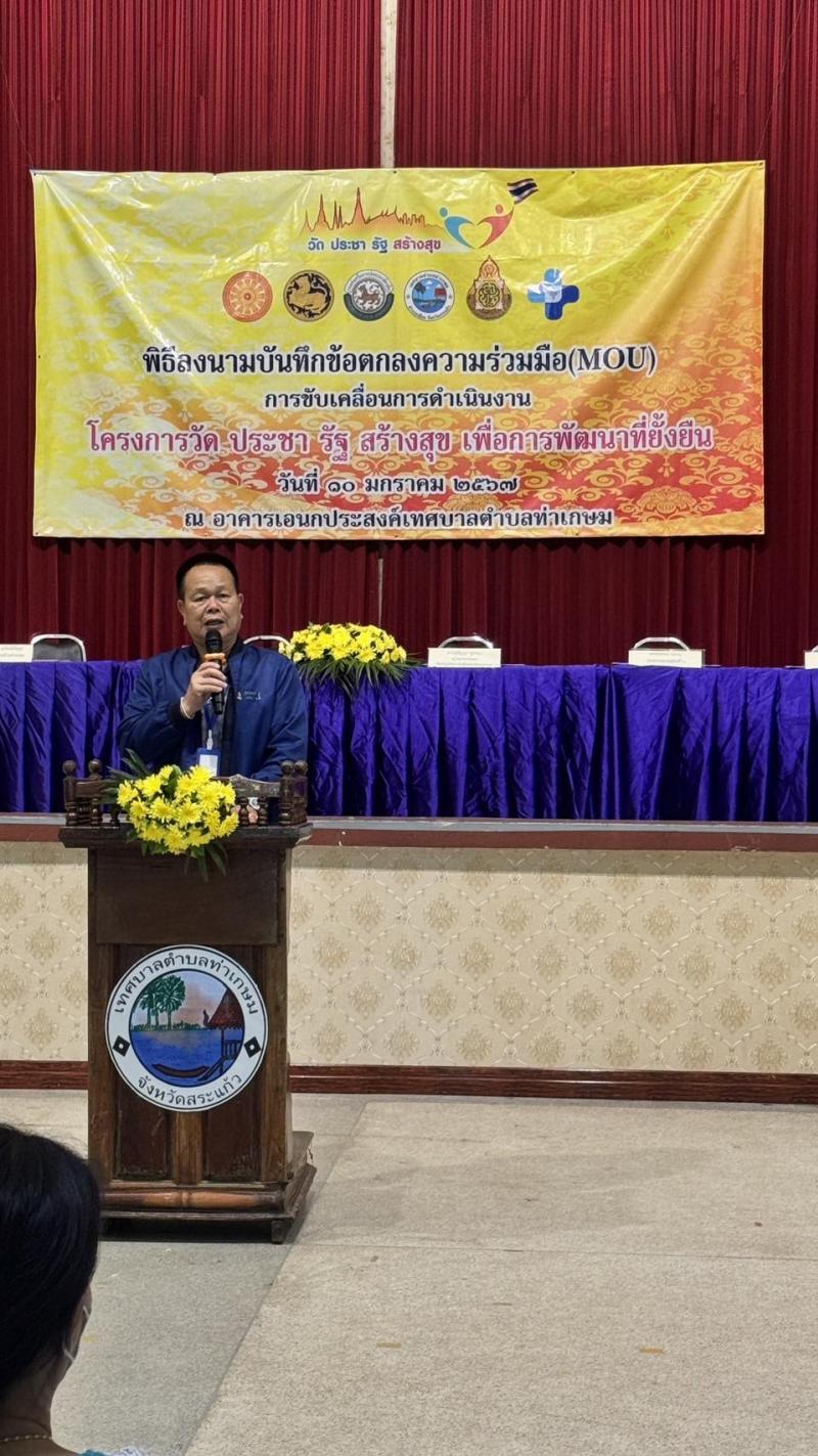 เทศบาลตำบลท่าเกษม อำเภอเมืองสระแก้ว จังหวัดสระแก้ว ระหว่าง 3 องค์กร ได้แก่ วัดท่าเกษม วัดหัวกุญแจ เทศบาลตำบลท่าเกษม โรงเรียนบ้านท่าเกษม โรงพยาบาลส่งเสริมสุขภาพท่าเกษม ชุมชน ประธานชุมชนเทศบาลตำบลท่าเกษม เพื่อให้เกิดผลเป็นรูปธรรมและมีแนวทางบูรณาการความร่วมมือ ร่วมกับทุกภาคส่วนราชการ/องค์กรภาคีเครือข่ายตำบลและภาคประชาชน ตระหนักถึงความสำคัญของการบูรณาการระหว่างวัดกับหน่วยงานในพื้นที่ เพื่อร่วมมือดำเนินการตามแนวทางการขับเคลื่อนโครงการ “วัด ประชา รัฐ สร้างสุข เพื่อการพัฒนาอย่างยั่งยืน” โดยใช้แนวทาง ๓ - 5 - ๗ - ๙ คือ 3 พันธกิจ ๕ ส ๗ ขั้นตอน ๙ พื้นที่ โดยทุกภาคส่วนมีส่วนร่วมเพื่อการจัดสิ่งแวดล้อมที่เอื้อต่อสุขภาพ รวมถึงกิจกรรมเชิงพุทธ โดยจะก่อให้เกิดความเชื่อมโยงและสัมพันธภาพที่ดีให้เกิดขึ้นระหว่างวัดกับชุมชน ส่งผลให้พระสงฆ์มีสุขภาพแข็งแรง วัดมีความมั่นคง ชุมชนมีความเข้มแข็งสืบต่อไป