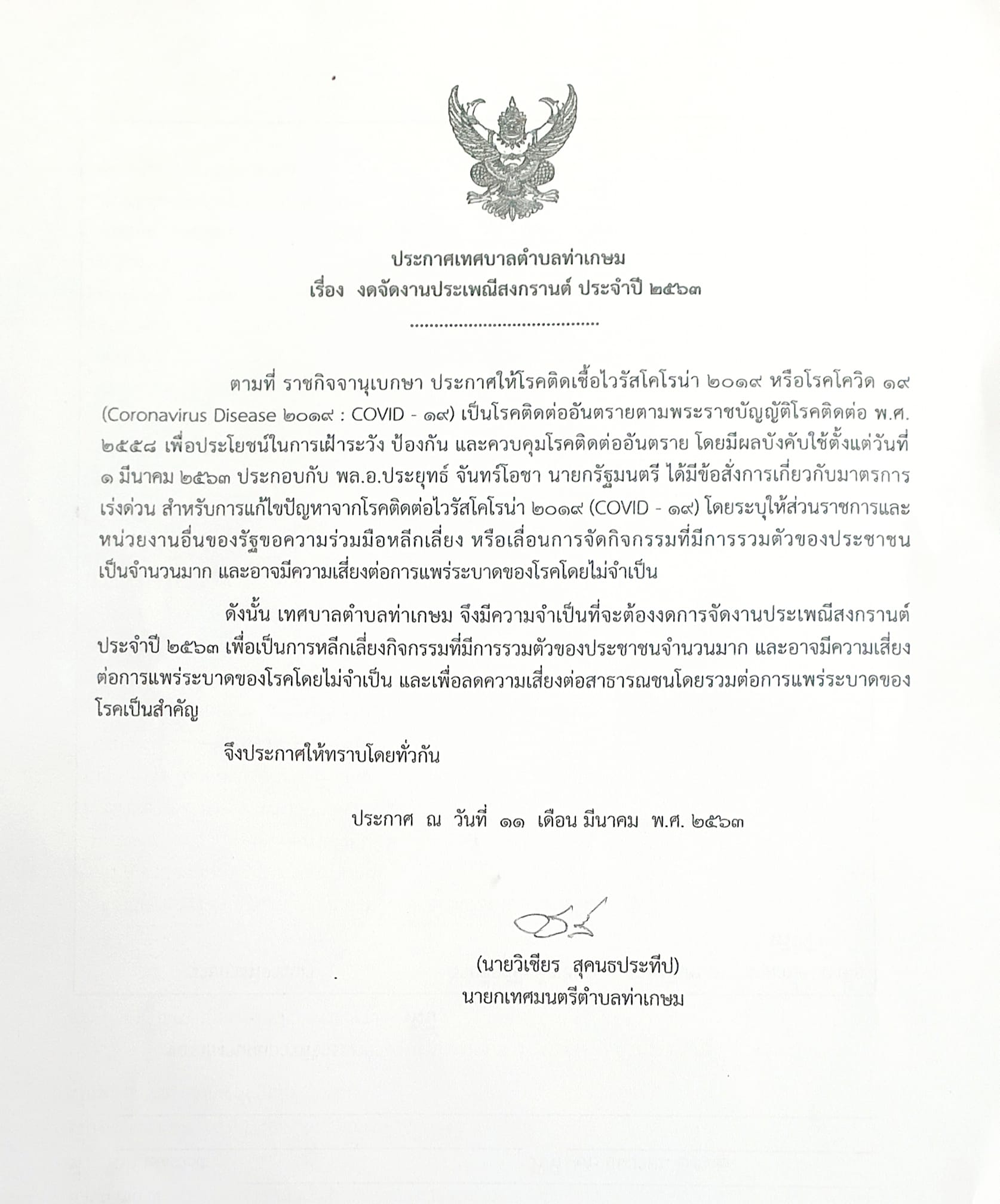 ประกาศงดจัดงานประเพณีสงกรานต์ ประจำปี 2563