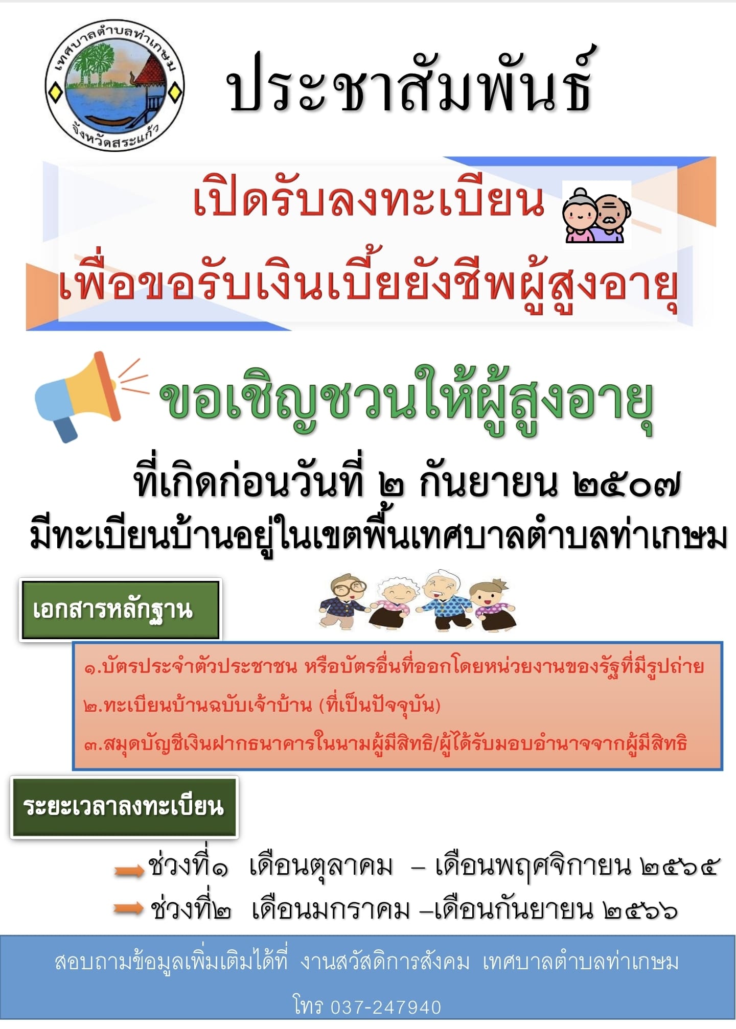 ประชาสัมพันธ์ เปิดรับลงทะเบียนเพื่อขอรับเงินเบี้ยยังชีพผู้สูงอายุ