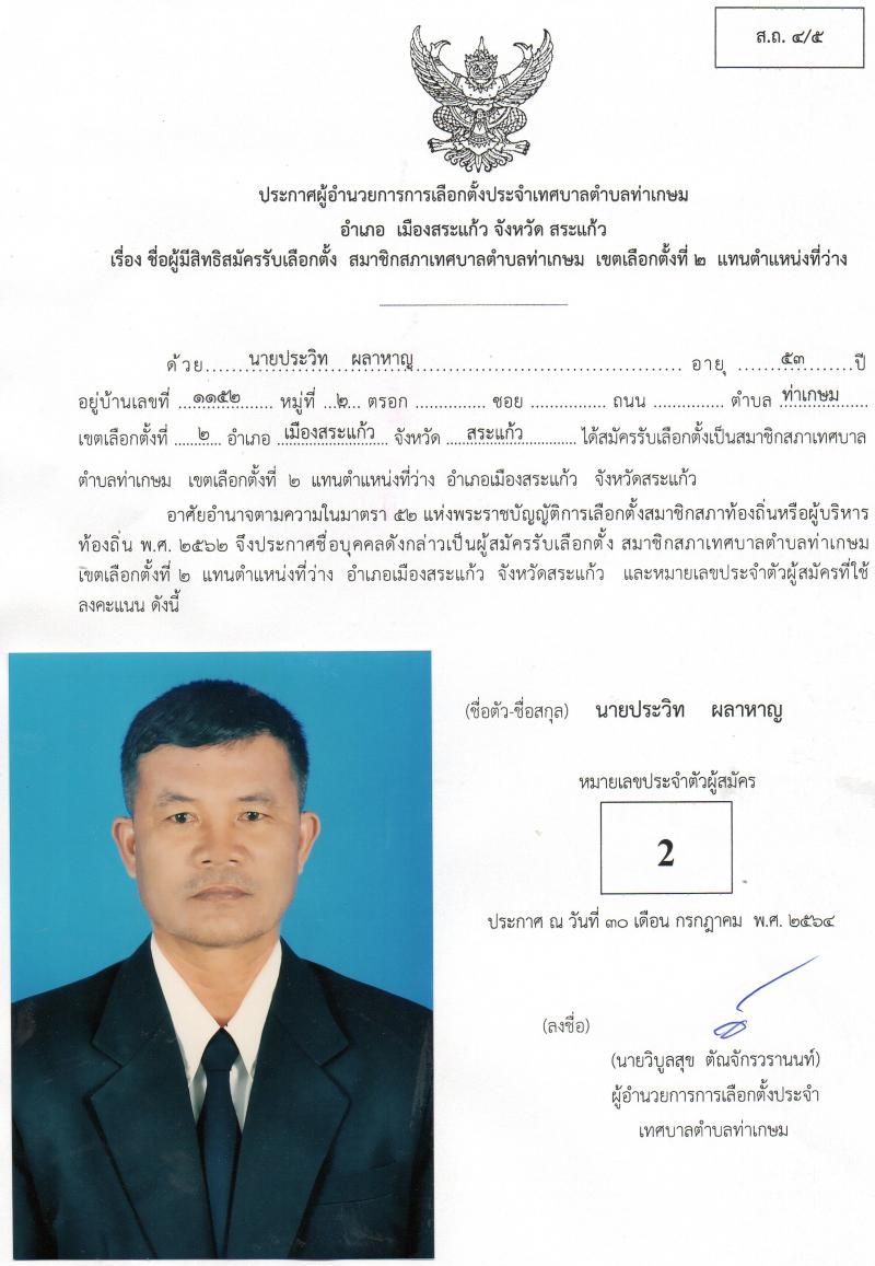 ประกาศผู้อำนวยการการเลือกตั้งประจำเทศบาลตำบลท่าเกษม เรื่อง บัญชีรายชื่อผู้สมัครรับเลือกตั้งสมาชิกสภาเทศบาลท่าเกษม เขตเลือกตั้งที่ 2 (แทนตำแหน่งว่าง)