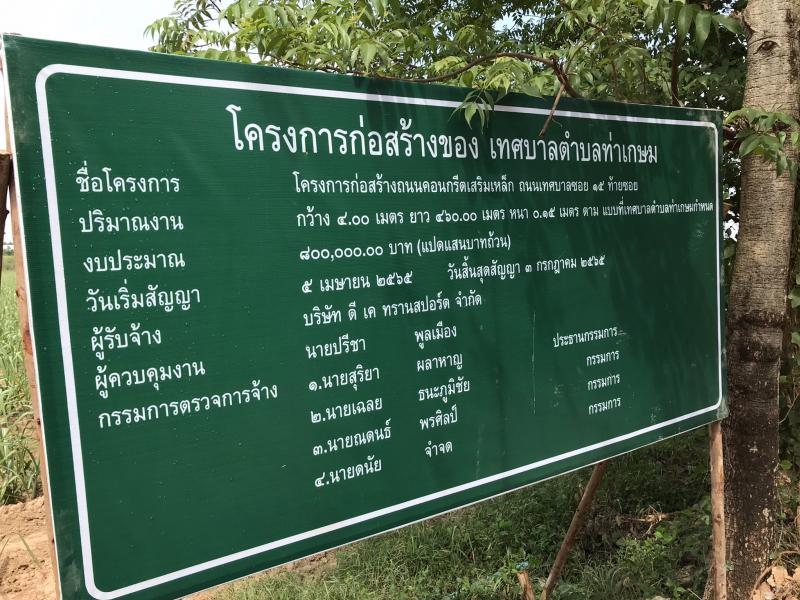 รายละเอียด : การบริหารสัญญา โครงการก่อสร้างถนนคอนกรีตเสริมเหล็ก ถนนเทศบาลซอย 15 ท้ายซอย ขนาดกว้าง 4.00 เมตร ยาว 460.00 เมตร ตามแบบแปลนที่เทศบาลตำบลท่าเกษมกำหนด งบประมาณ 800,000.00 บาท ตามสัญญาจ้างเลขที่ 001/2565 ลงวันที่ 4 เมษายน 2565 โดย บริษัท ดี เค ทรานสปอร์ต จำกัด ผู้รับจ้าง
